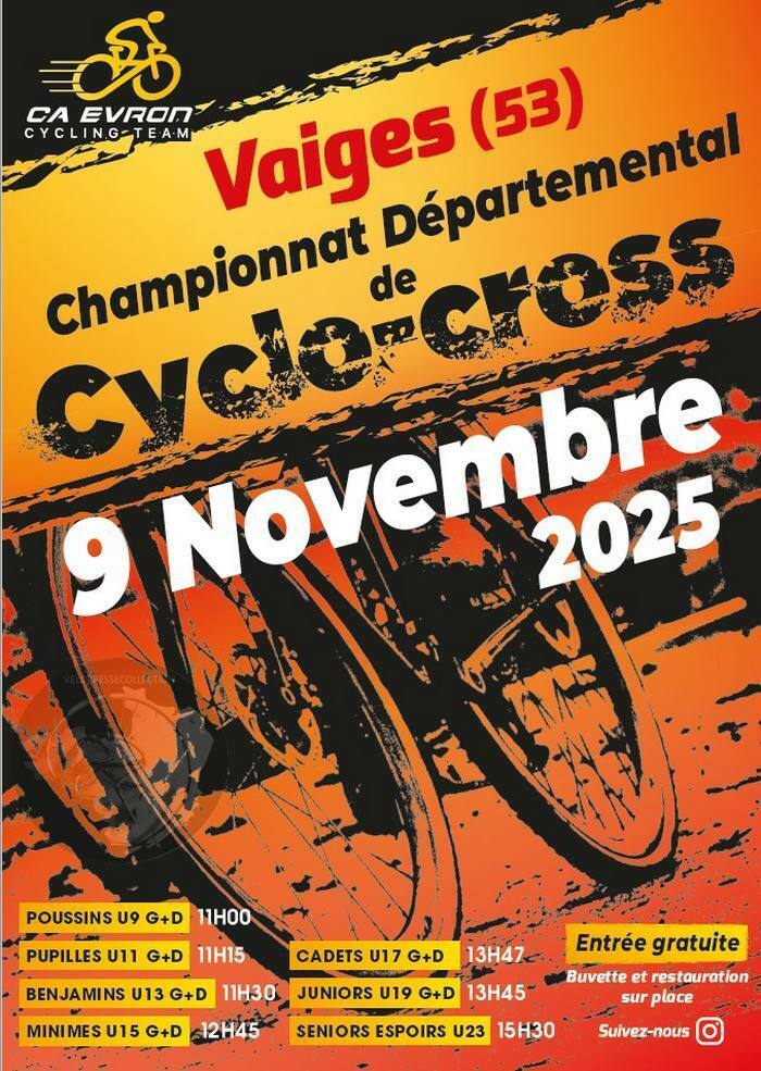 VAIGES LE DIMANCHE 9 NOVEMBRE 2025 CHAMPIONNAT DEPARTEMENTAL DE CYCLO-CROSS TOUS LES DETAILS SUR L 'AFFICHE.
