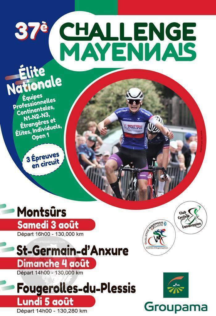 Affiche de la 37ème édition du Challenge Mayennais Cycliste, course Elite et open 1 organisée par le Comité d’Organisation Challenge Mayennais Cycliste 53 et CC Landivy du 3 au 5 août 2024.