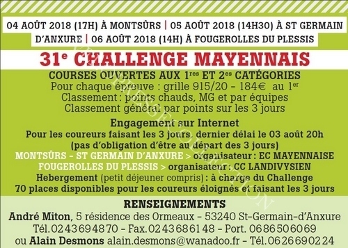 Le 31ème Challenge Mayennais 2018 aura lieu  du 4 au 6 août.