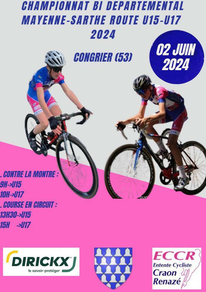 Championnat bi départemental Mayenne Sarthe route U15-U17 organisé par l’Entente Cycliste Craon Renazé à Congrier (53) le 2 juin 2024 avec au programme un contre la montre le matin d'environ 5kms et une course en circuit l’après-midi.