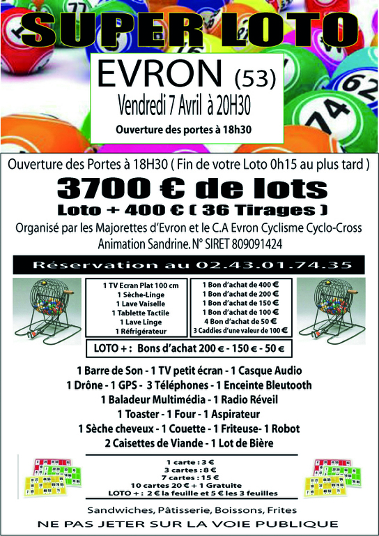 Ouverture des Portes à 18H30 ( Fin de votre Loto 0h15 au plus tard )