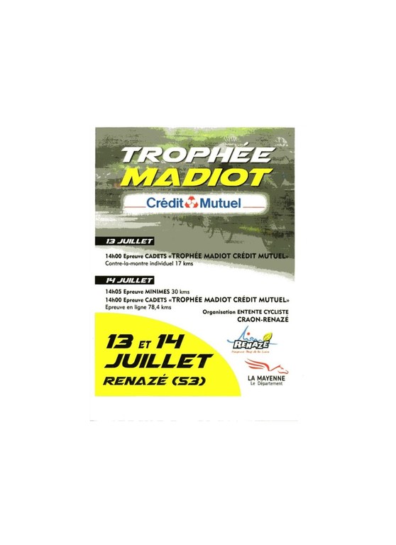Les 4ème et 5ème manche du Trophée Madiot 2018, épreuve réservée aux cadets,  se dérouleront à Renazé (53) les 13 et 14 juillet.