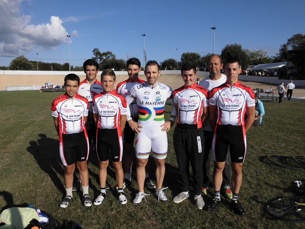 photo: François PERVIS Champion du Monde avec les coureurs de la sélection de la Mayenne et leurs nouveaux équipements.